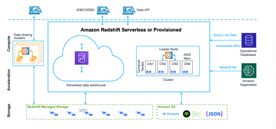 Large scale data warehousing. Fully managed by Amazon. Can use SQL-based tools to analyze large datasets.