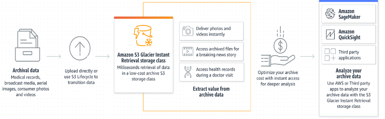 S3 Glacier is low-cost cloud storage service designed by AWS for archiving and long-term data backup. Designed to provide a cost-effective service for storing large amounts of archival data that doesn’t require immediate access. Part of S3 family.